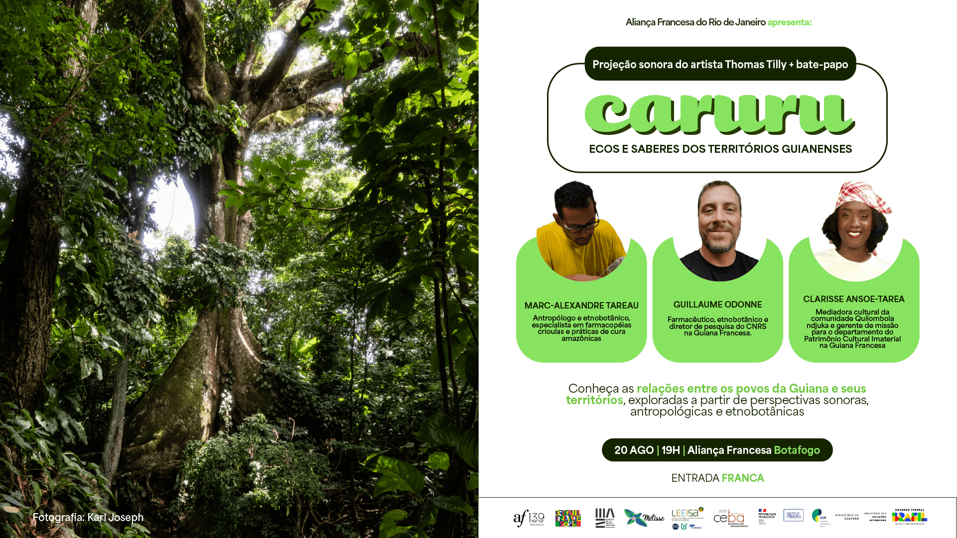 🔊 Apresentação de trechos do projeto sonoro “Caruru: escutar os povos da Guiana” pelo artista francês Thomas Tilly em colaboração com o antropólogo Marc-Alexandre Tareau. As obras mergulham nas paisagens acústicas da Guiana, destacando vozes, línguas e sons dos ambientes de vida de diversas comunidades e suas relações com a natureza e os saberes tradicionais. As criações serão apresentadas em francês e crioulo, com legendas em português.